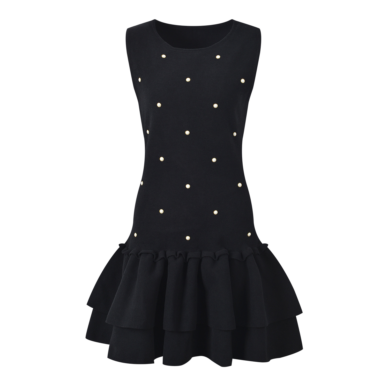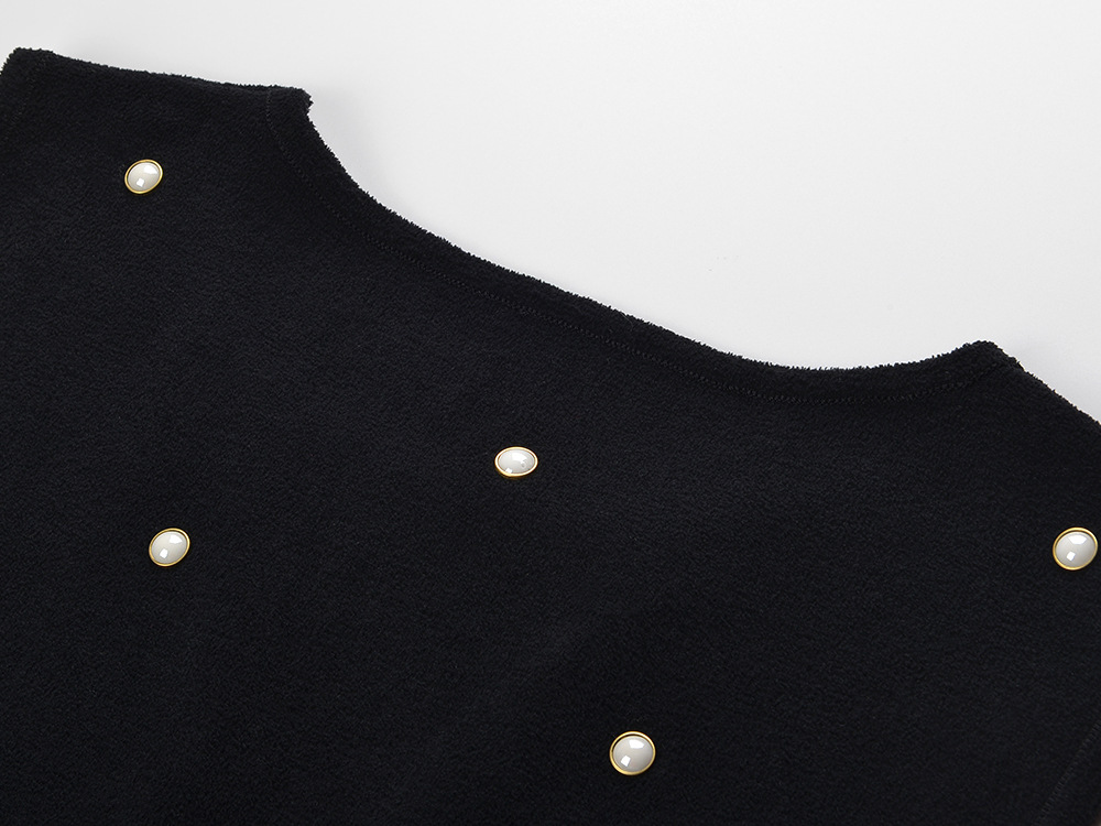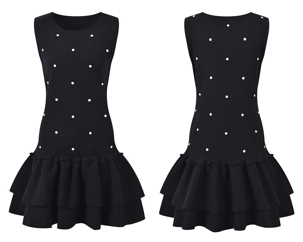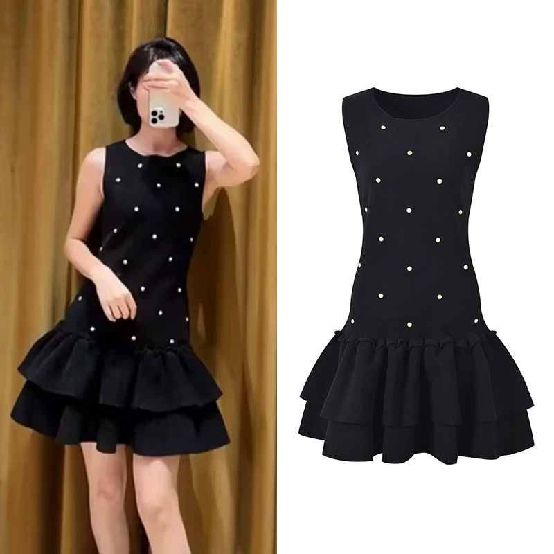 2024 autumn new heavy industry nail bead temperament fashionable slim fit and slimming black round neck sleeveless cake dress