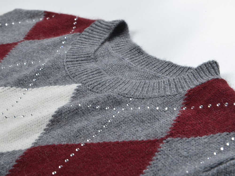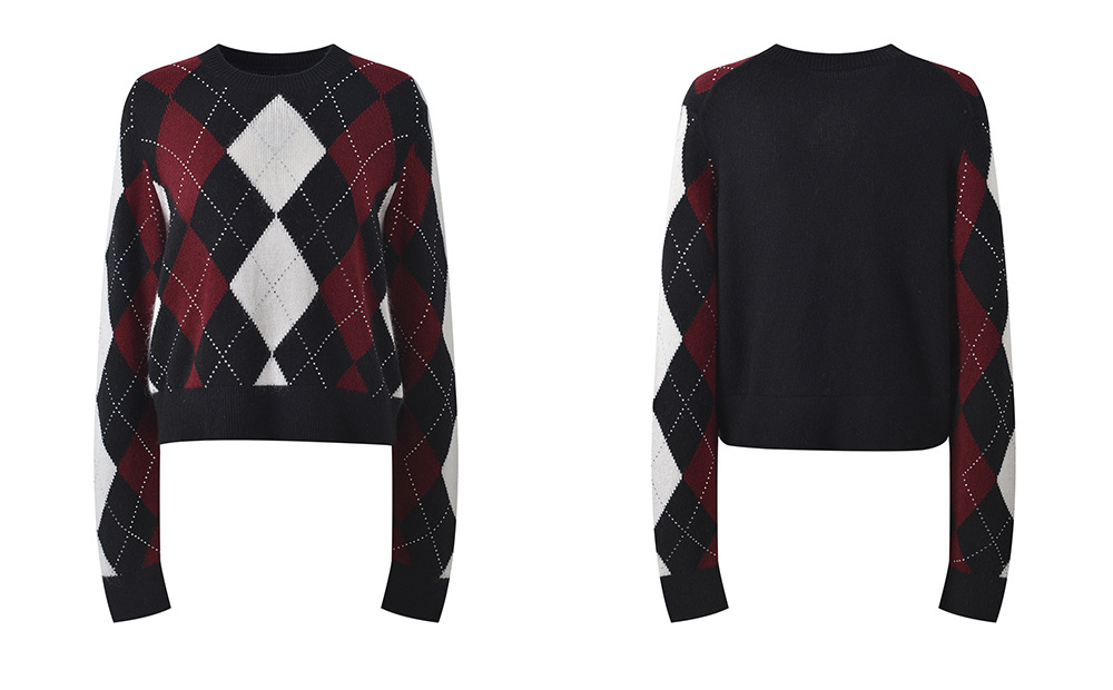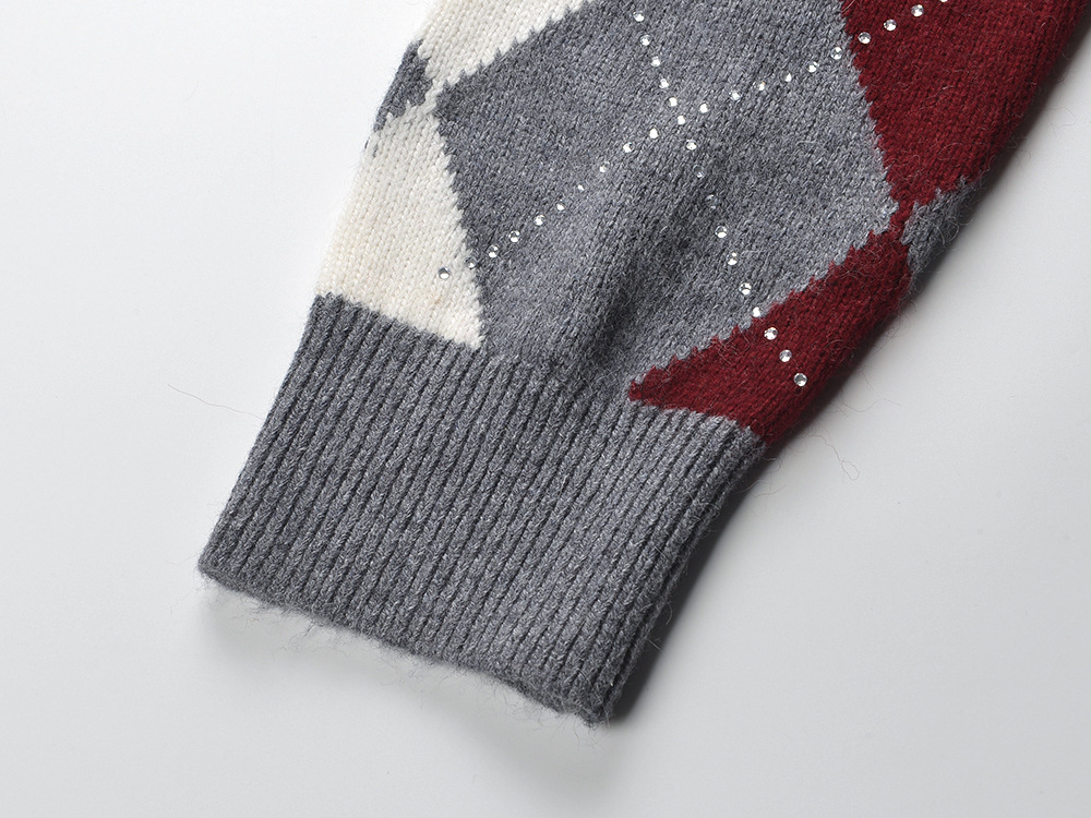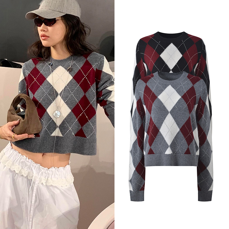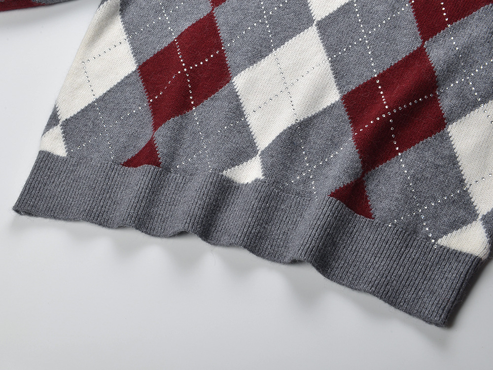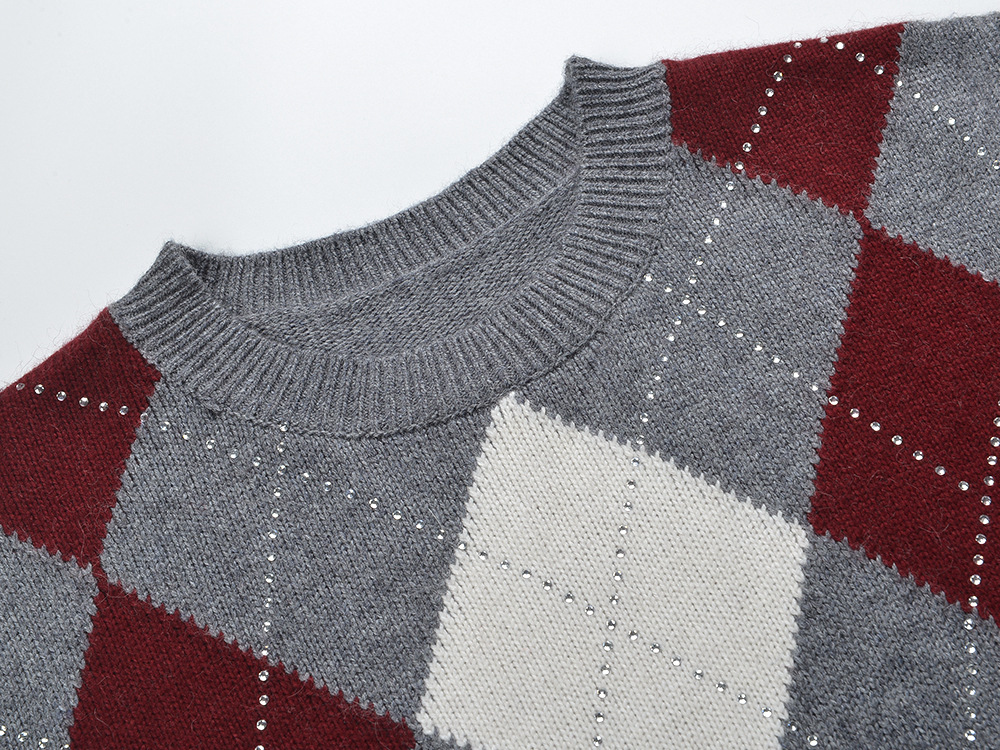 2025 autumn and winter new color contrasting diamond grid heavy industry hot stamping temperament fashionable and versatile short round neck knitted sweater sweater
