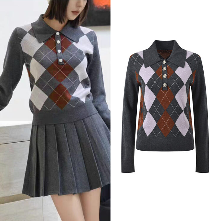 2025 autumn and winter new color contrasting diamond grid temperament fashionable age reducing and slimming versatile polo collar knitted sweater top