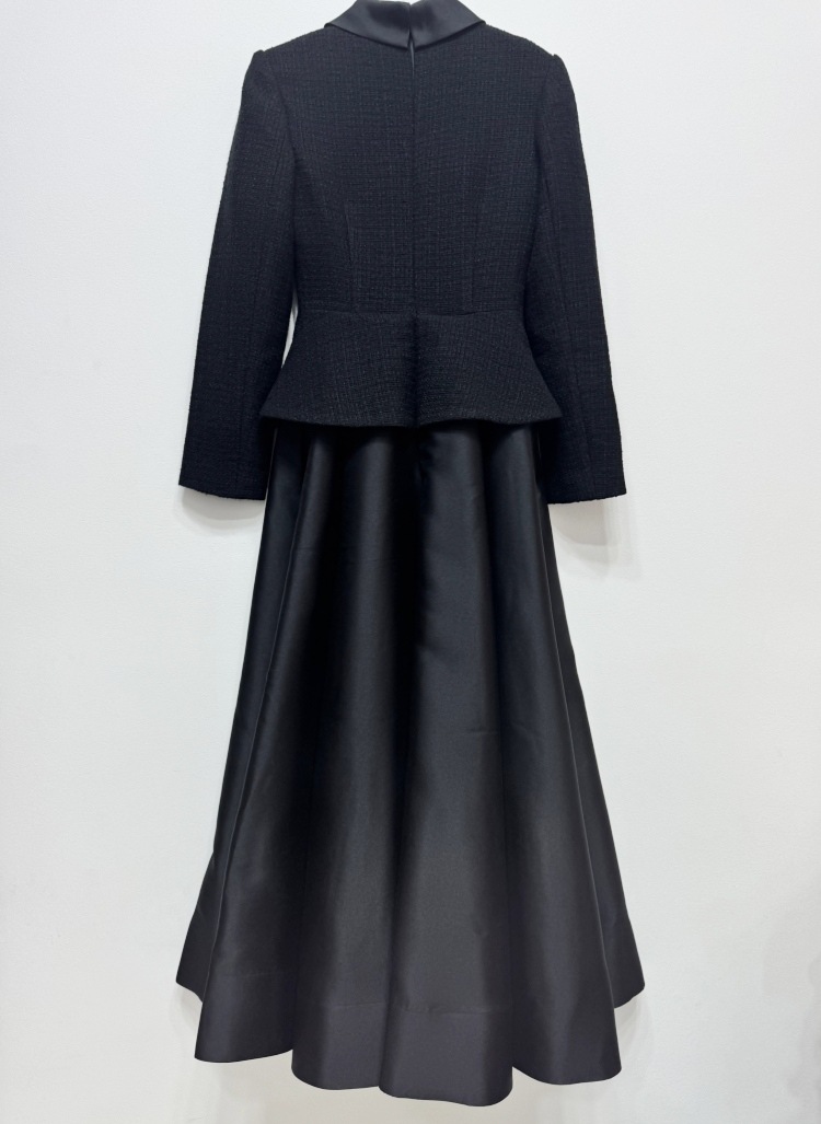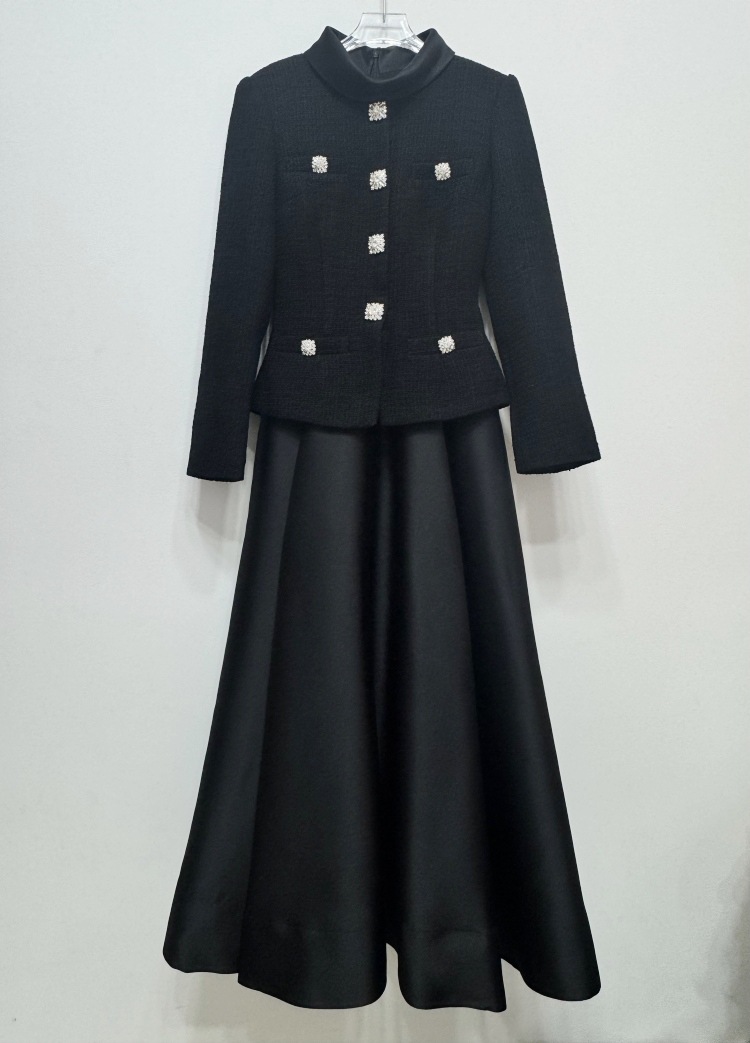 2025 autumn and winter new women’s clothing black coarse tweed splicing elegant temperament long sleeved small stand up collar dress evening gown