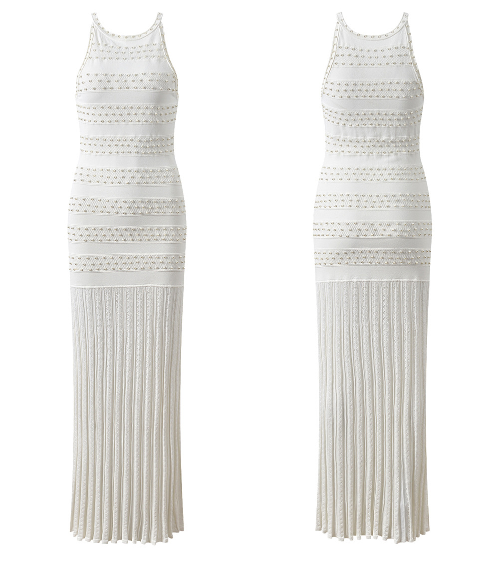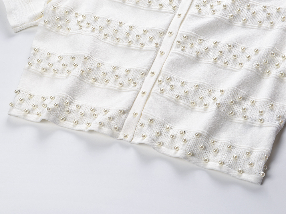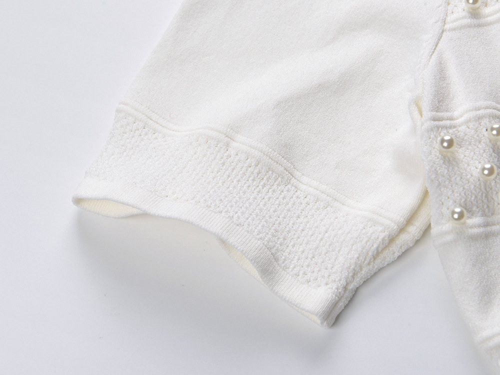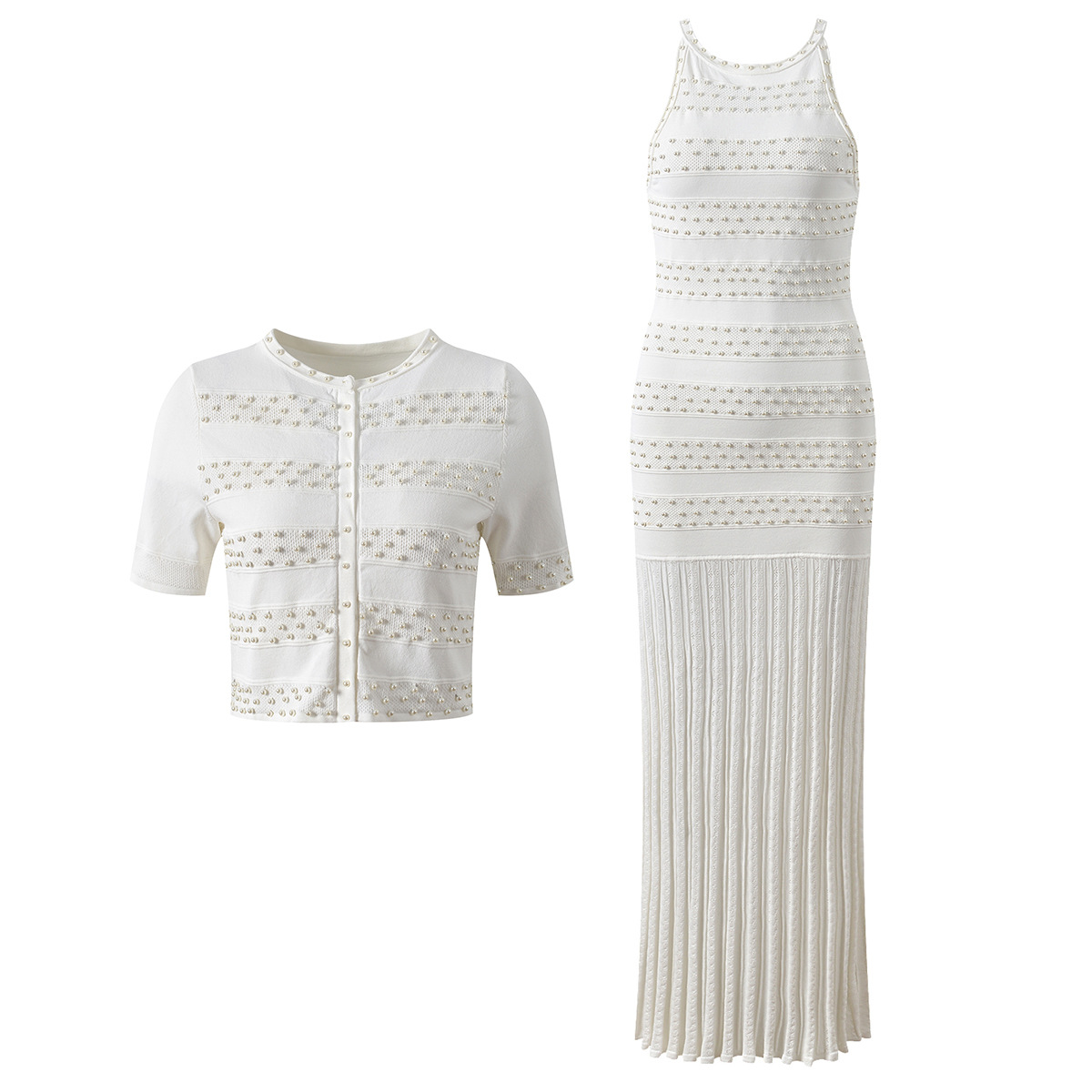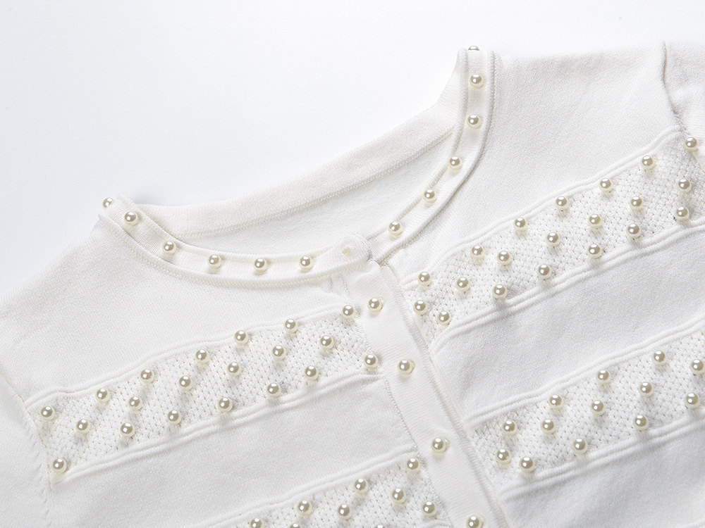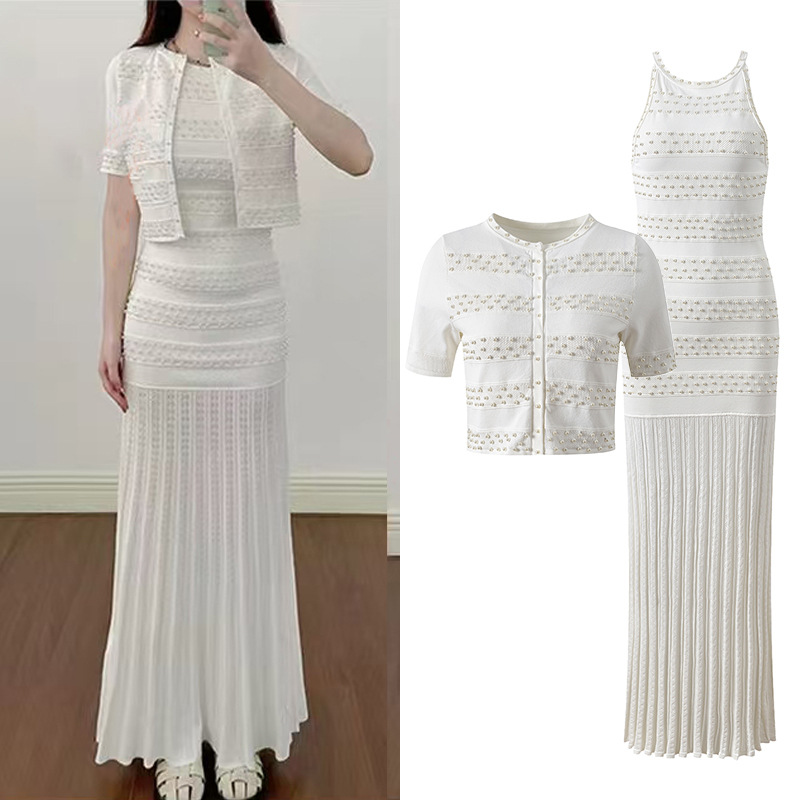 2025 Autumn-Winter New Model: Embellished Pearl, Elegant, Round Neck, Short Sleeve, Open Cardigan, Slim Fit, Slender Backless Dress Set