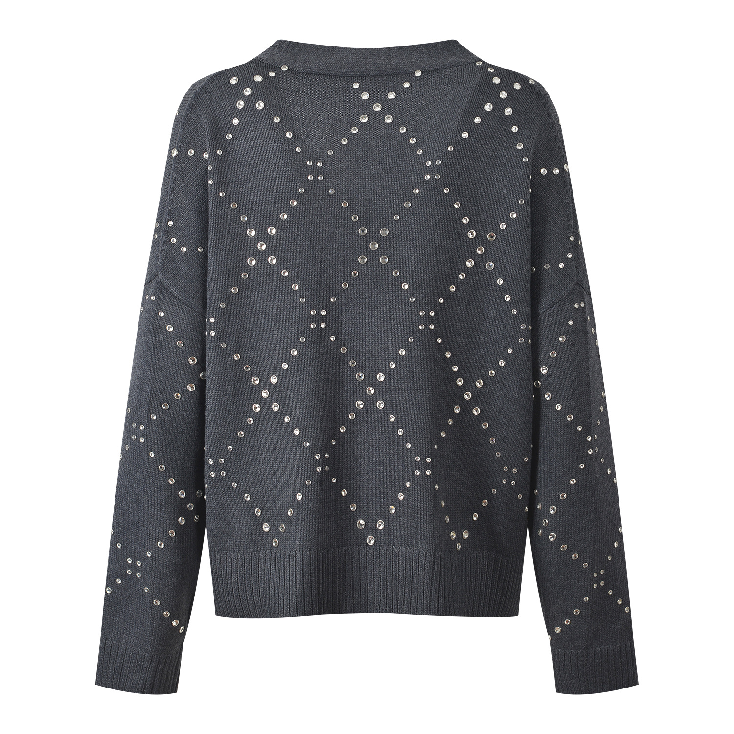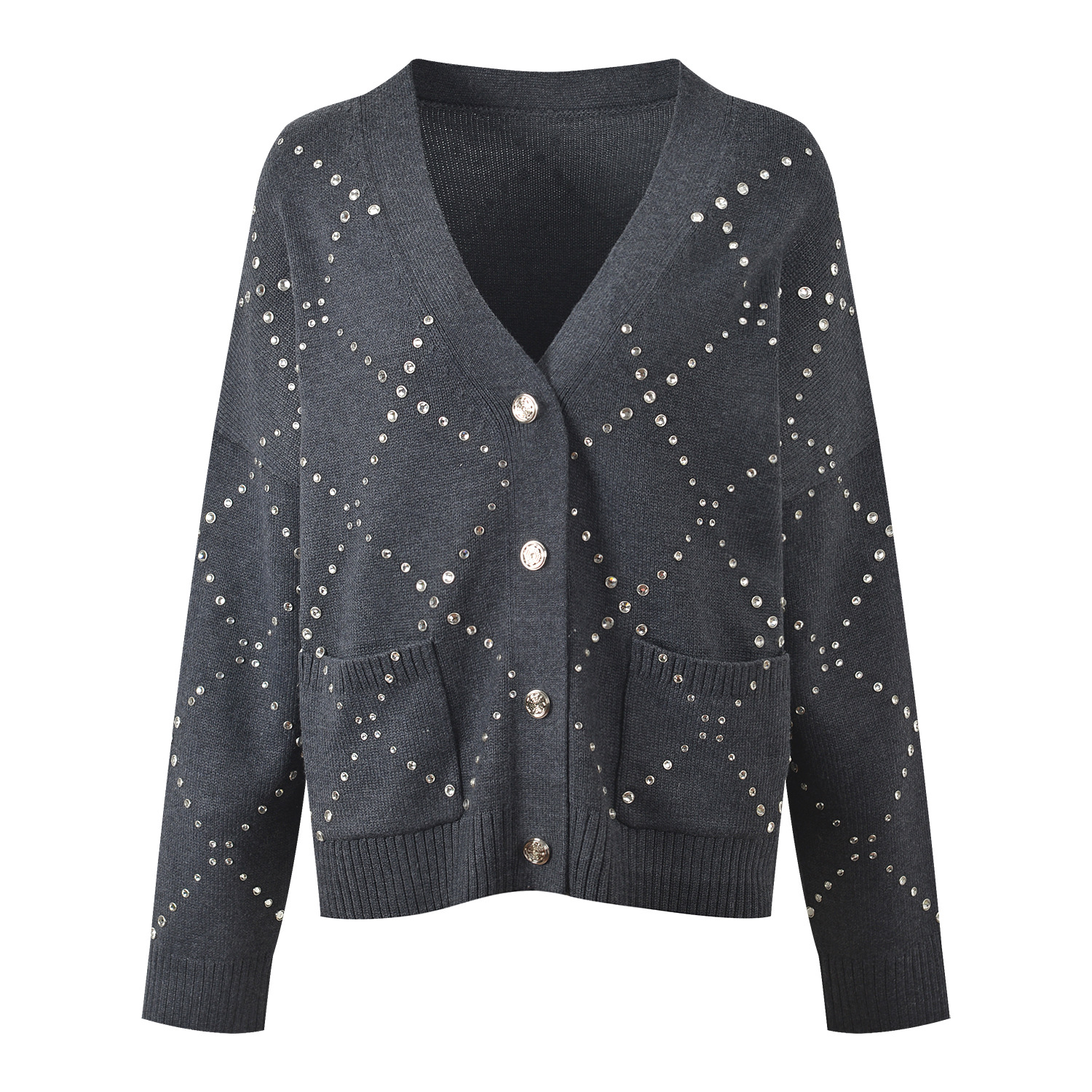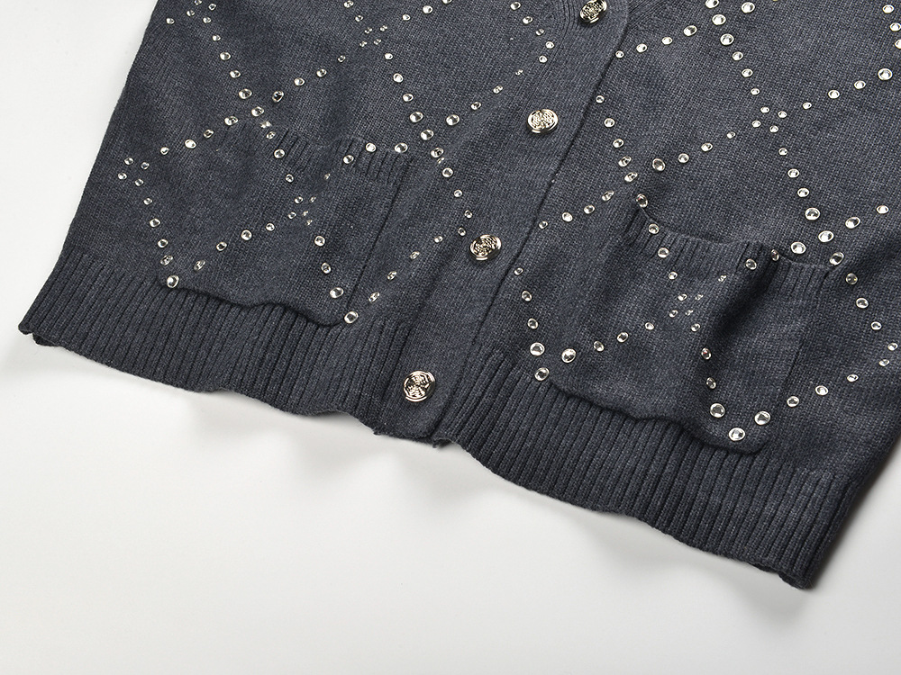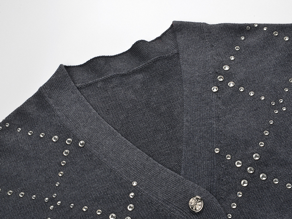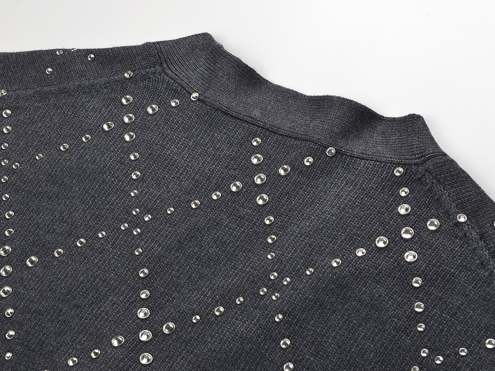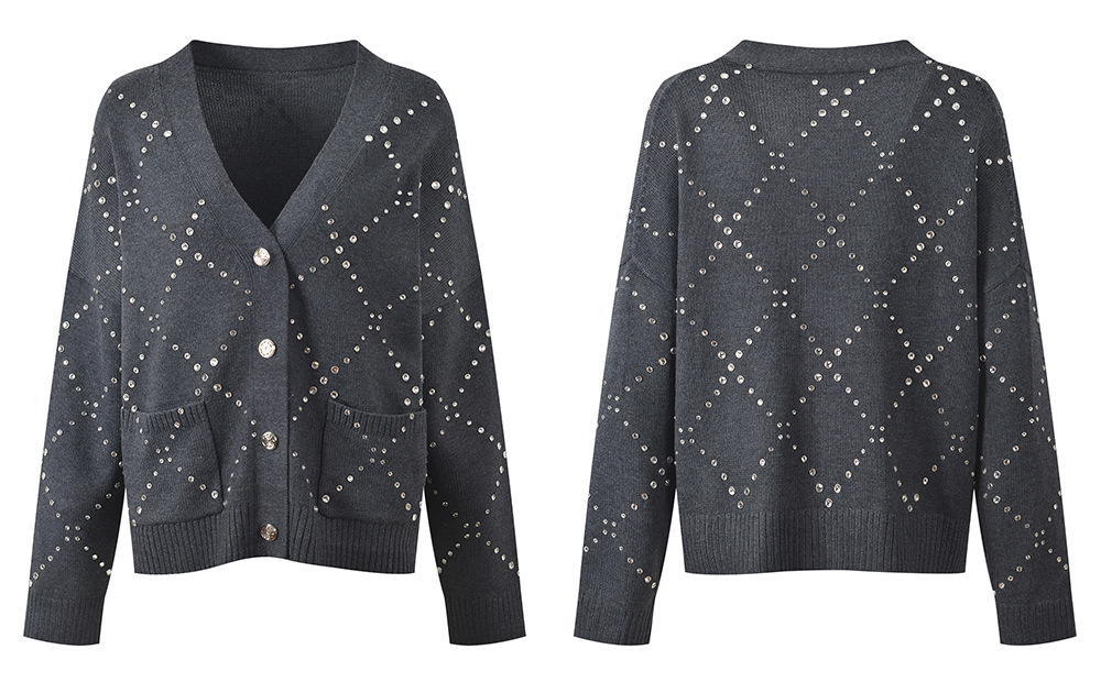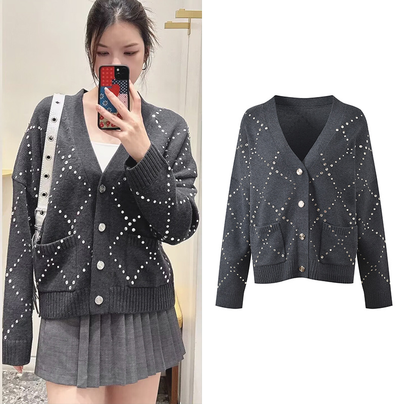 2025 Fall-Winter New Model Gray Heavy-Work Embroidered Beaded Loose Fashion Versatile Commuter V-Neck Knit Cardigan Sweater Jacket 5250348