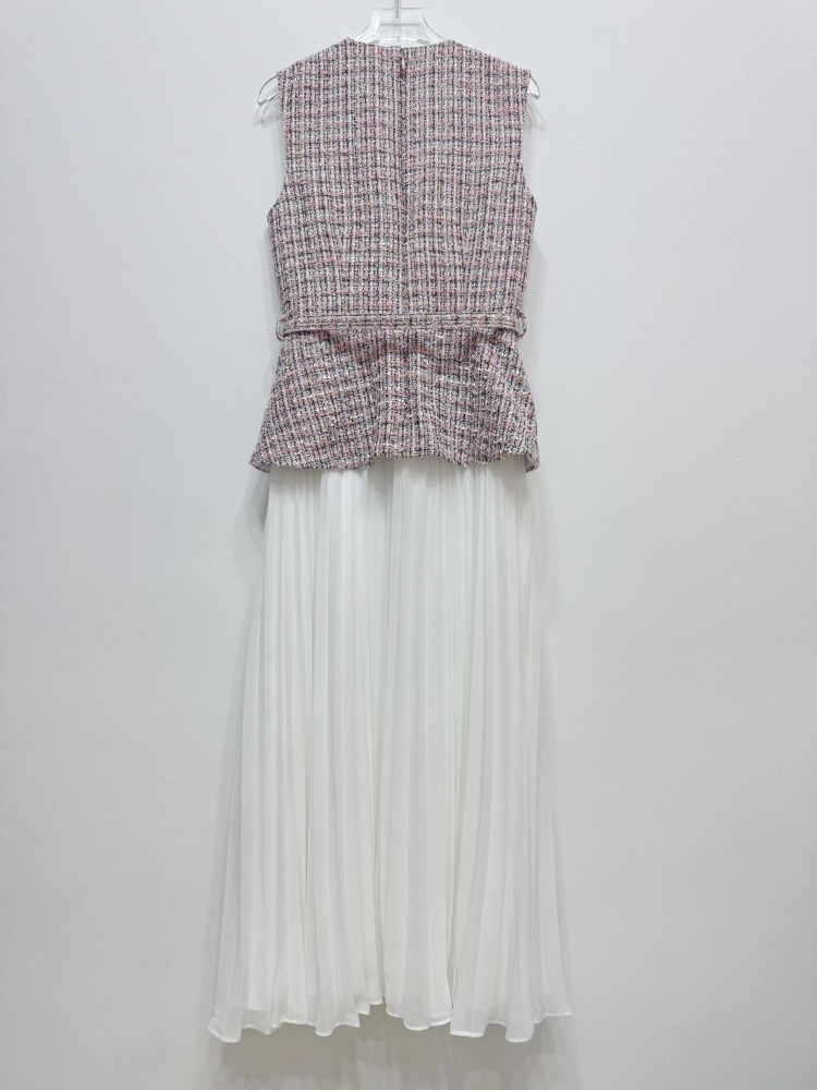 2025 Fall-Winter New Model: Red and Pink Mini Two-Layer Lace Dress with Round Neck, Sleeveless, Pleated, Long Skirt