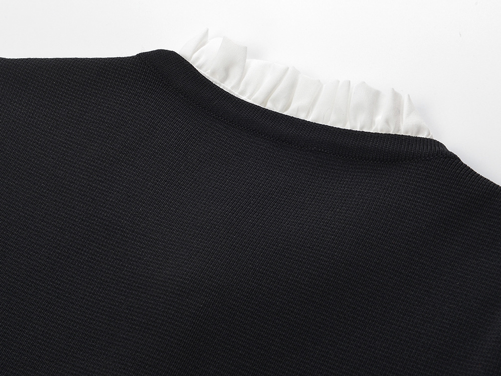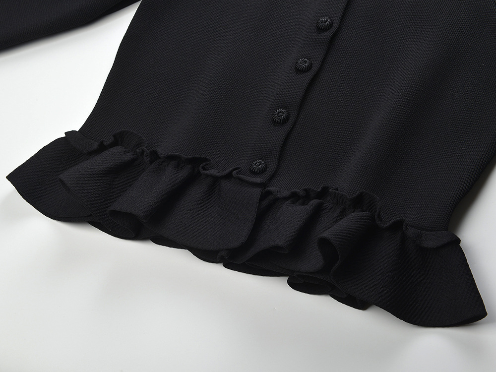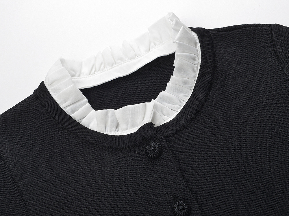 2026 early spring new color contrasting lace collar, ruffle hem, fashionable and versatile black knitted cardigan jacket