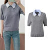 2026 Spring/Summer New Style Fake Two piece Shirt Collar Nail Bead Flower Short sleeved Top Fashionable Age reducing Versatile Knitted T-shirt