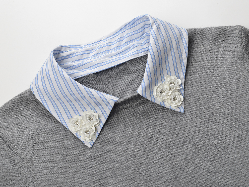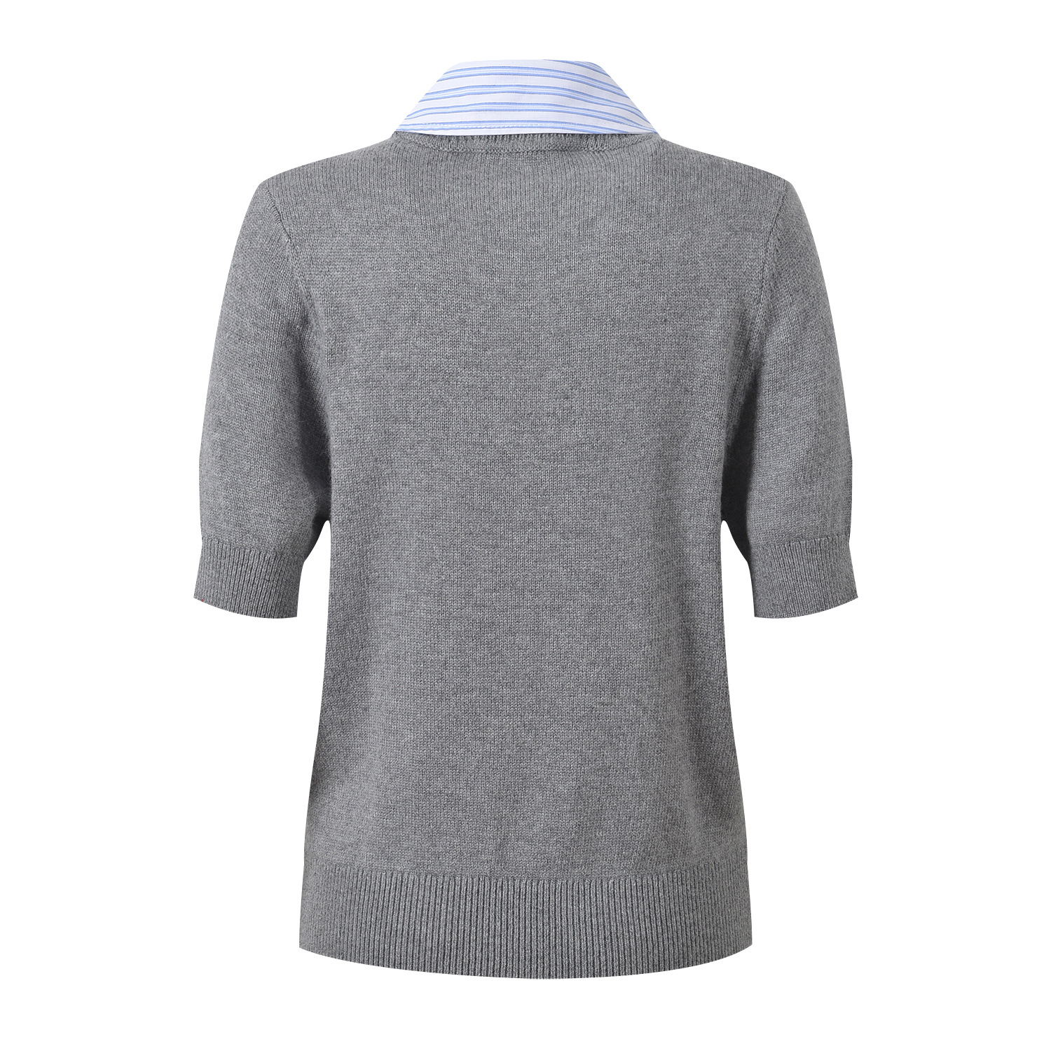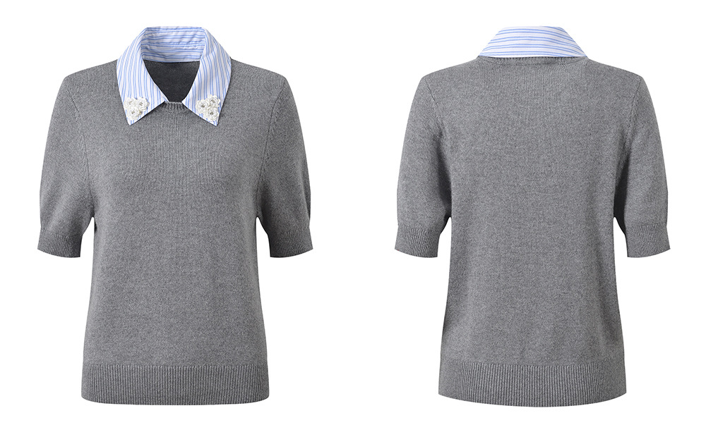 Be the first to review “2026 Spring/Summer New Style Fake Two piece Shirt Collar Nail Bead Flower Short sleeved Top Fashionable Age reducing Versatile Knitted T-shirt”