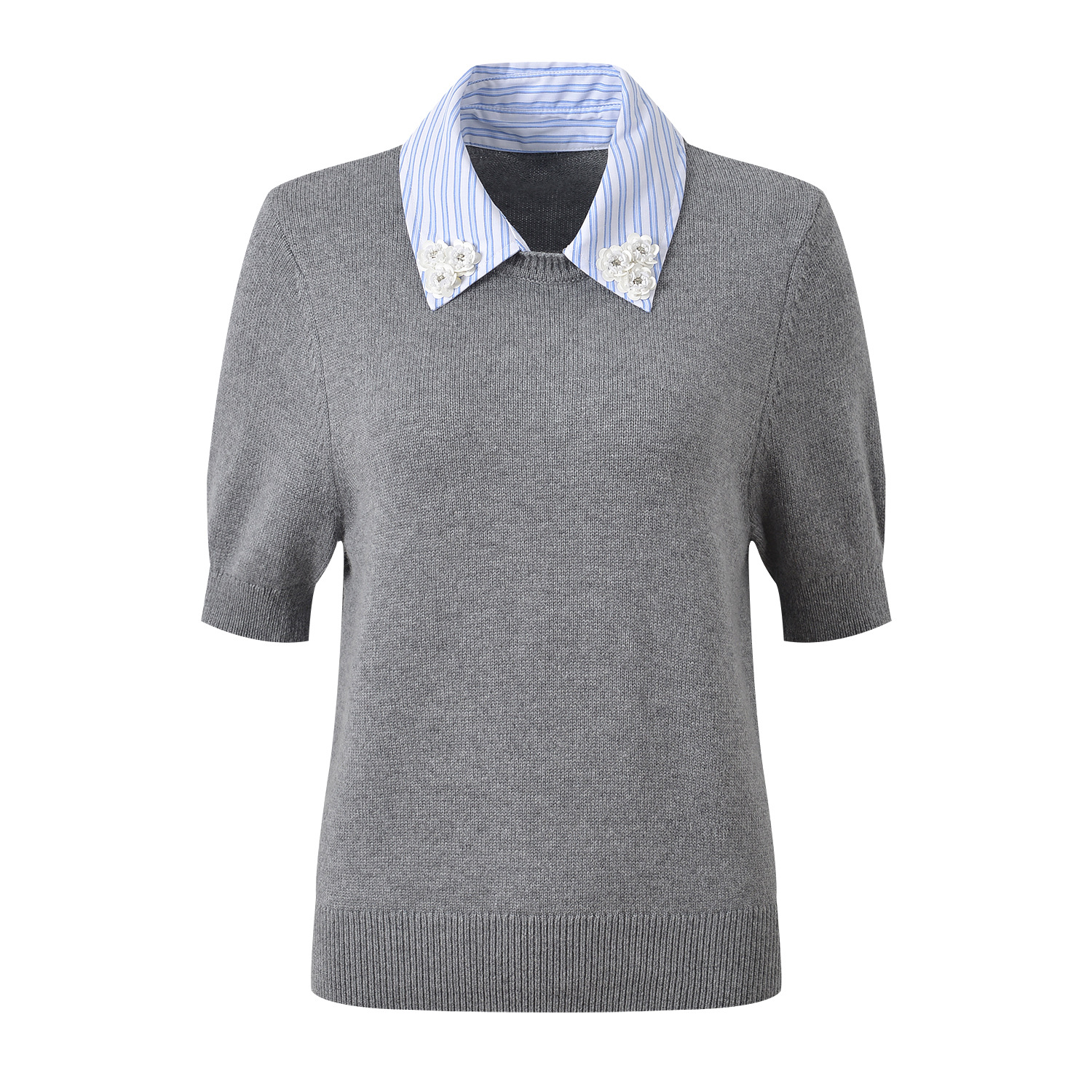 2026 Spring/Summer New Style Fake Two piece Shirt Collar Nail Bead Flower Short sleeved Top Fashionable Age reducing Versatile Knitted T-shirt