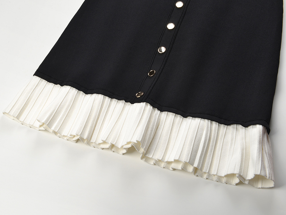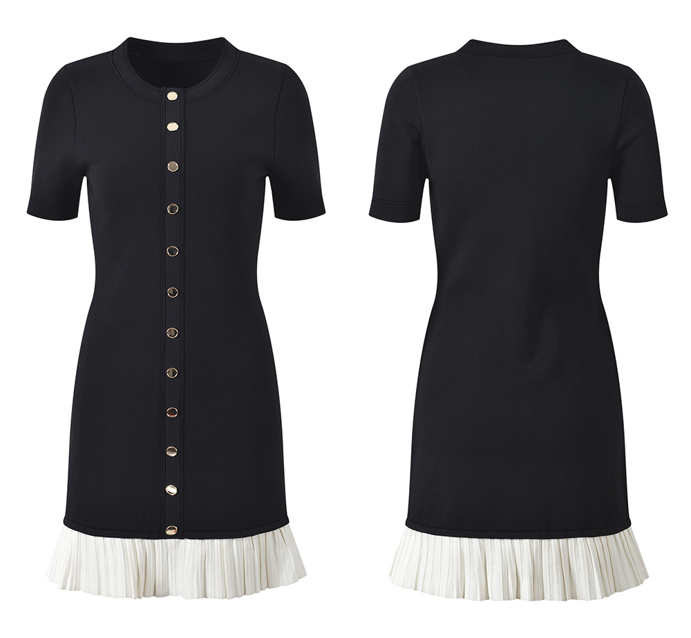 Black Pleated Hem Knitted Dress Women 2025 New O-Neck Short Sleeve Single-Breasted Ladies Slim Short Dresses 5240370