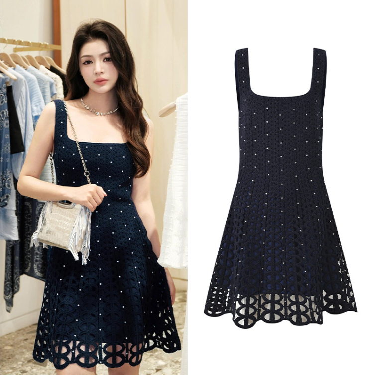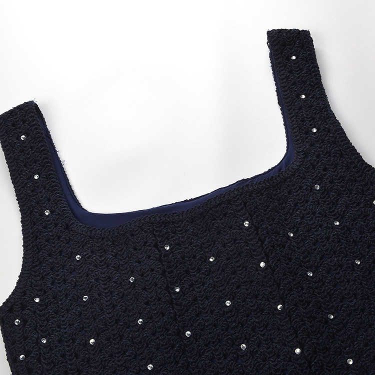 Dark Blue Mini Knitted Dress Women 2024 New Fashion Summer Halter Diamond Hollow Out Mini Dresses 5250068