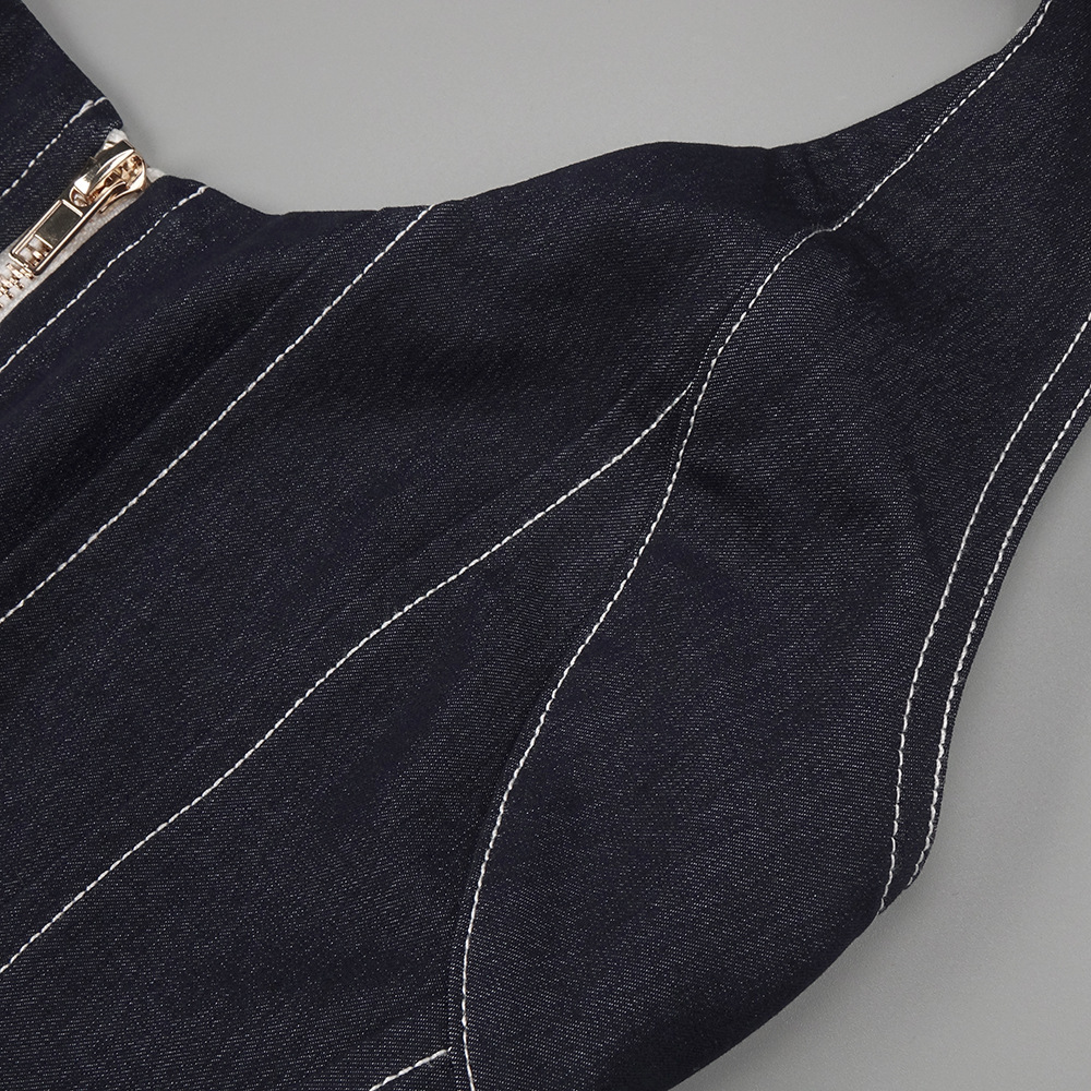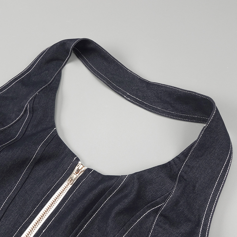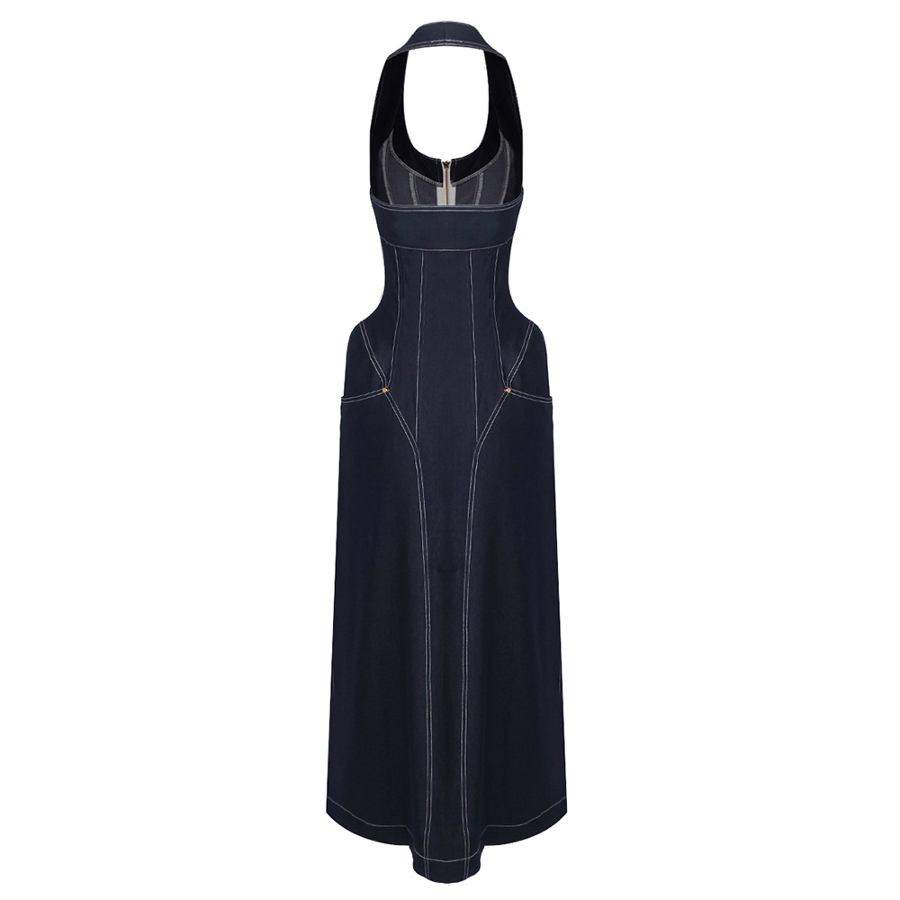 Elegant pure-colored sleeveless hanging neckline fitted back-exposed dress with a backpack silhouette featuring a touch of denim cross-border European-style summer