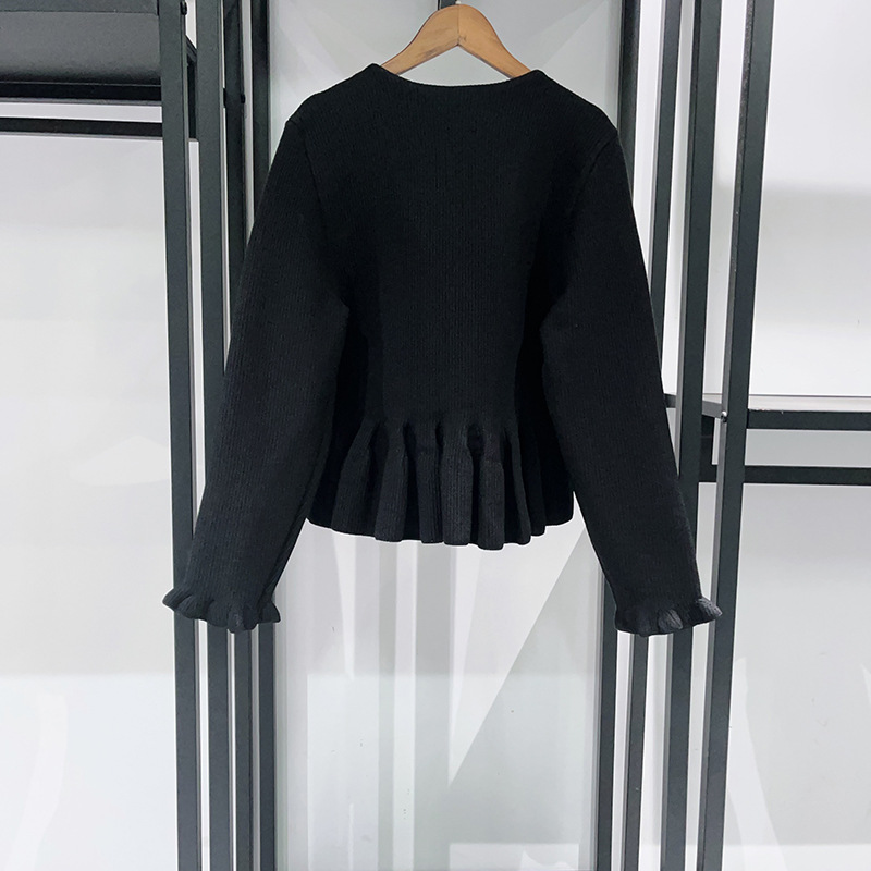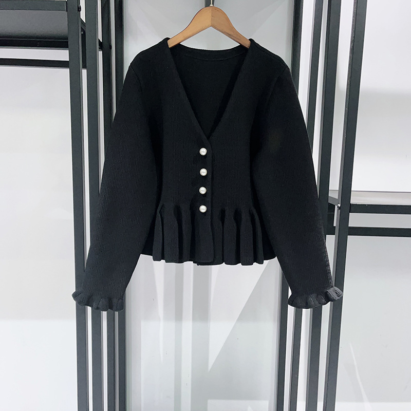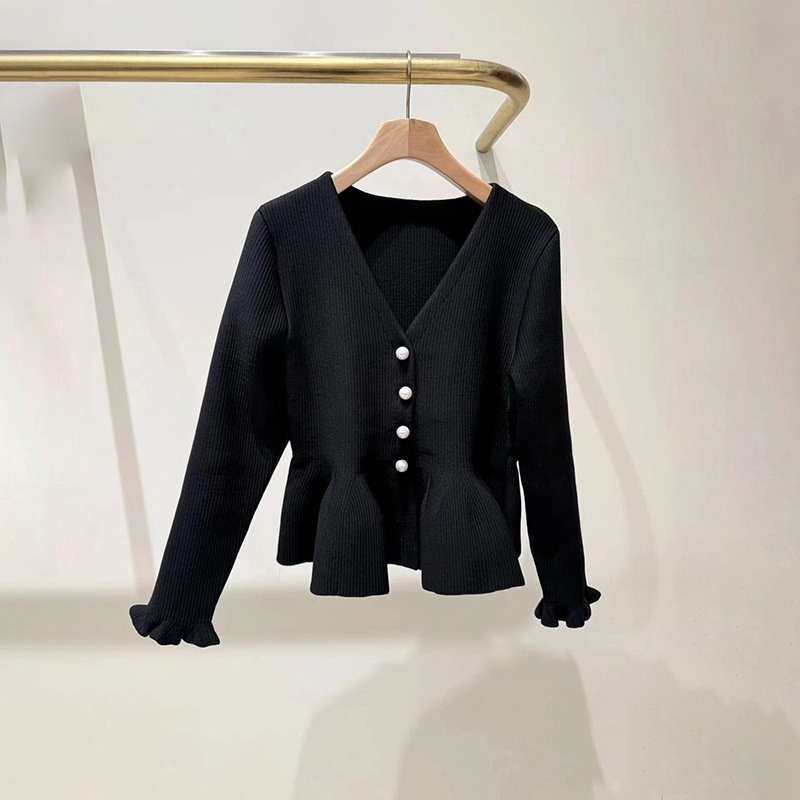 French style niche 2026 early spring pearl decoration lotus leaf hem pleated fungus edge cuffs V-neck knitted sweater 526042