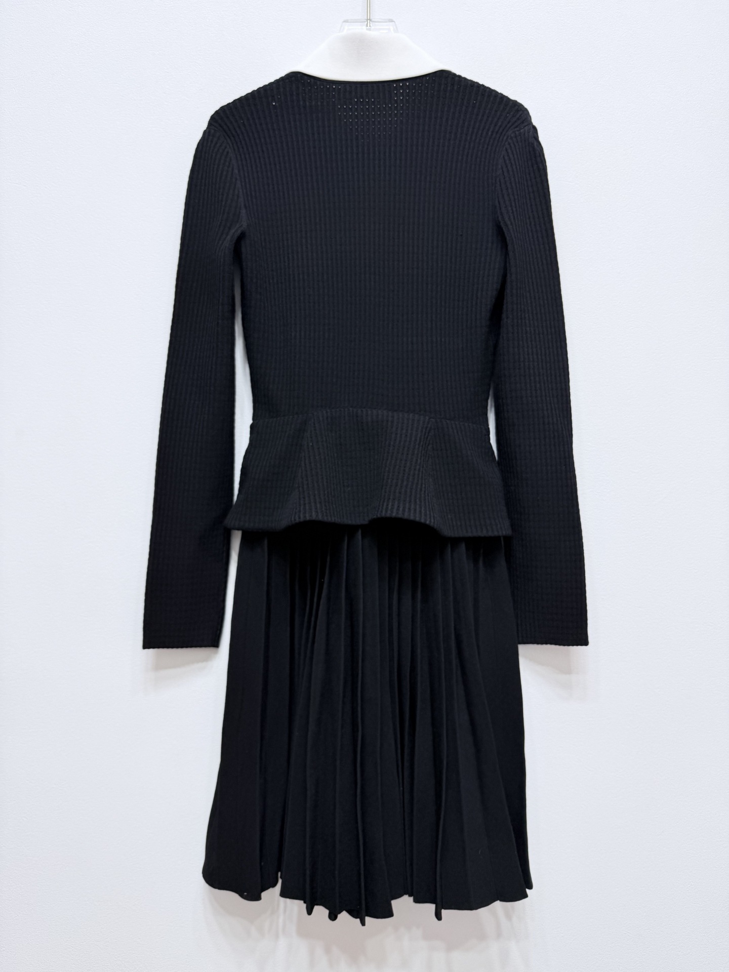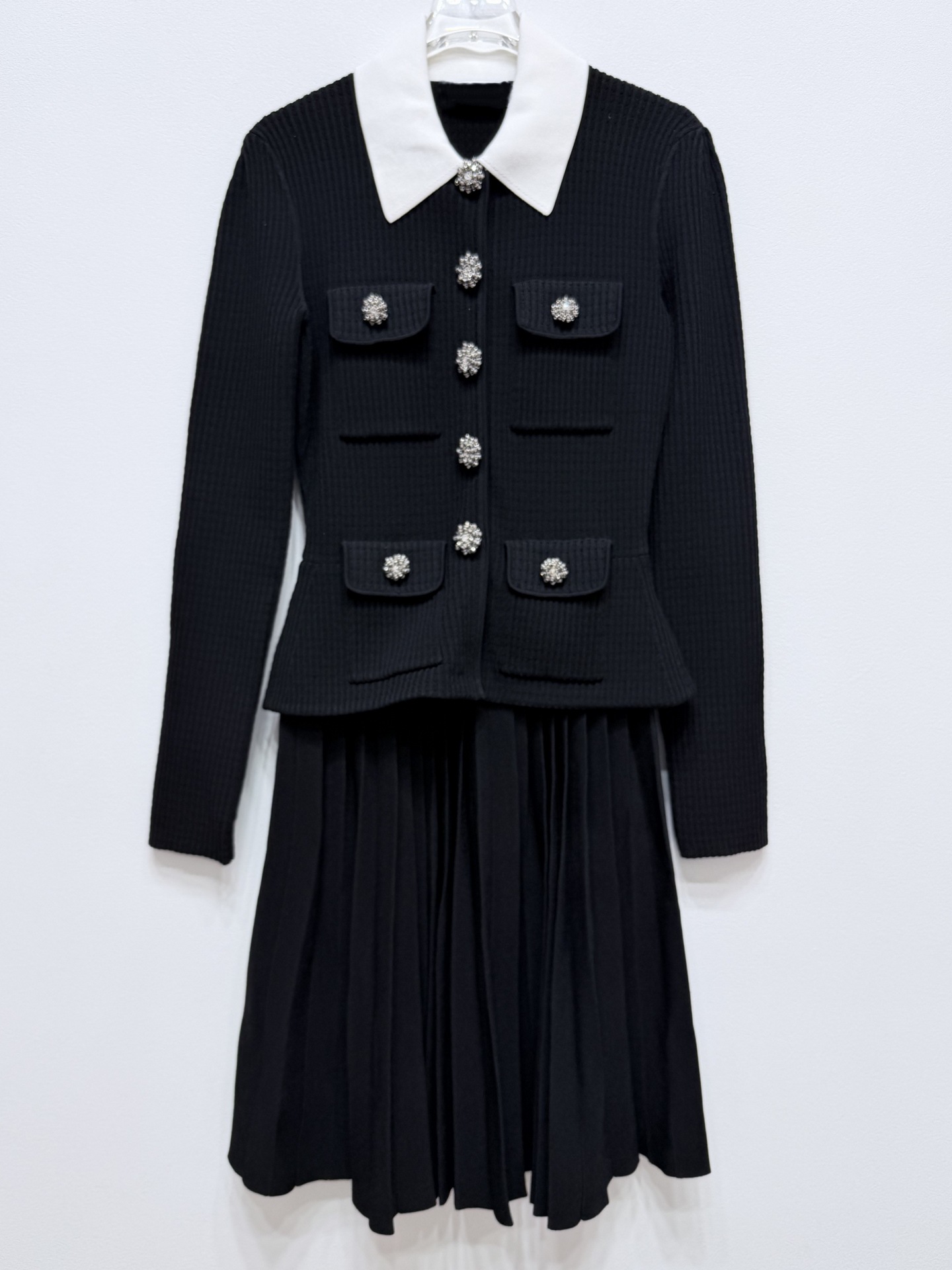 Qianjin style black lapel diamond embellished knitted dress, women’s new style mid skirt, star style sweater, retro pleated skirt