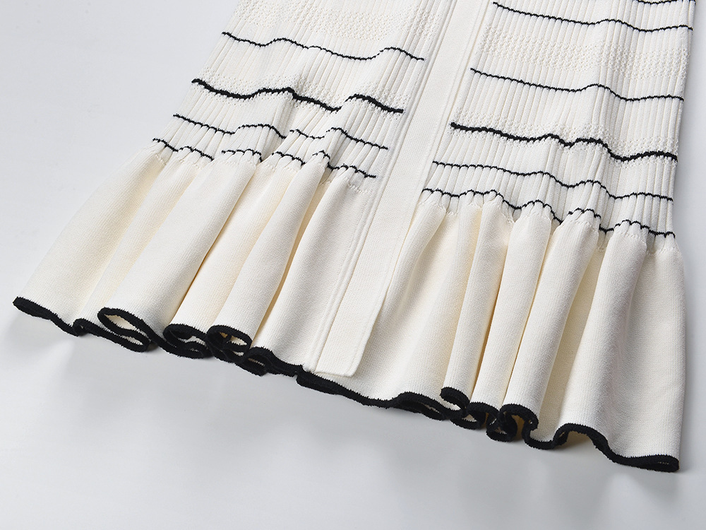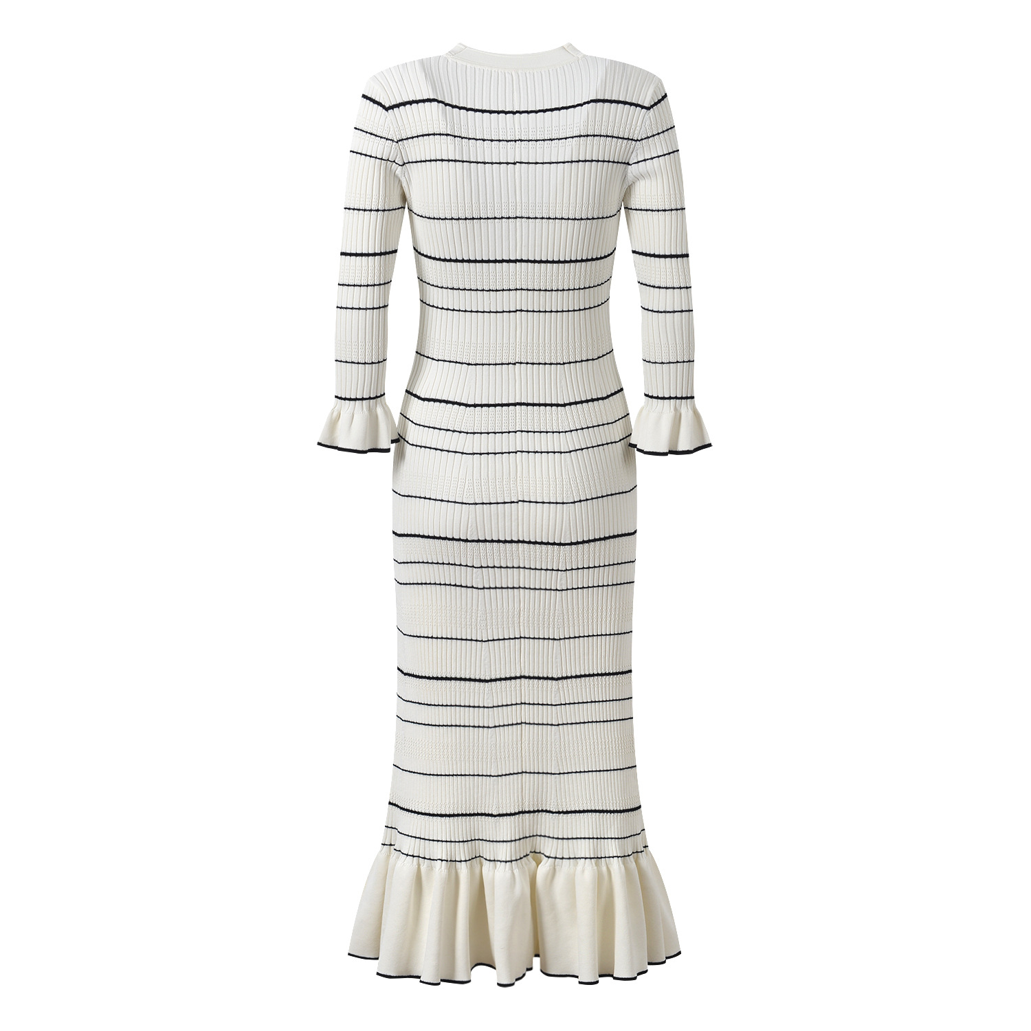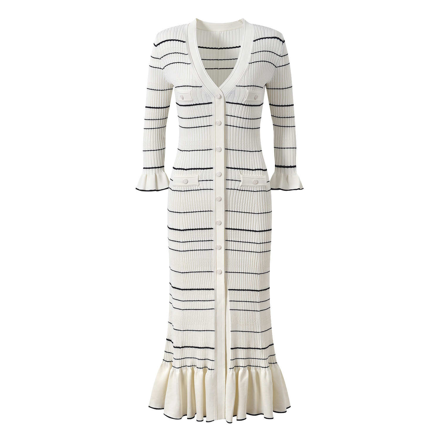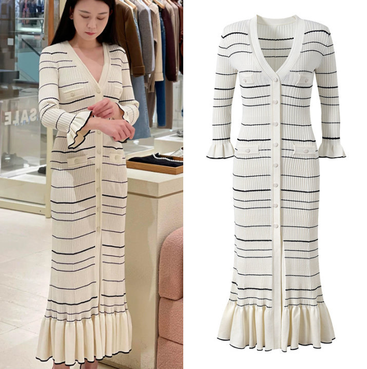 Stripes Knited Mid-Calf Dress Women 2025 Early Spring Lady V-Neck Single Breasted Slim Elegance Dress 5240361