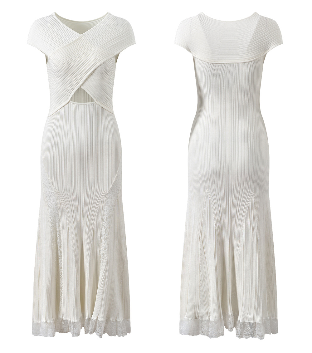 White Suspender Cross V-Neck Knitted Dress Women’s 2025 Summer Elegant Lace Desses 5250100