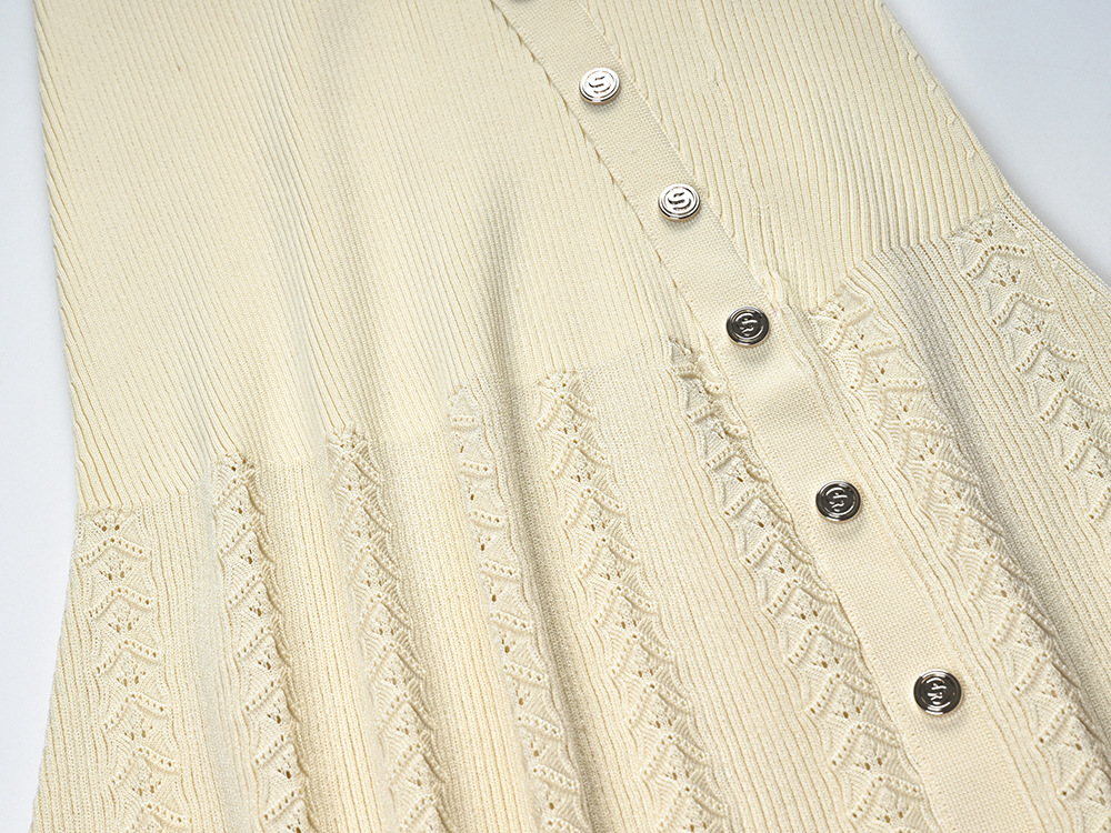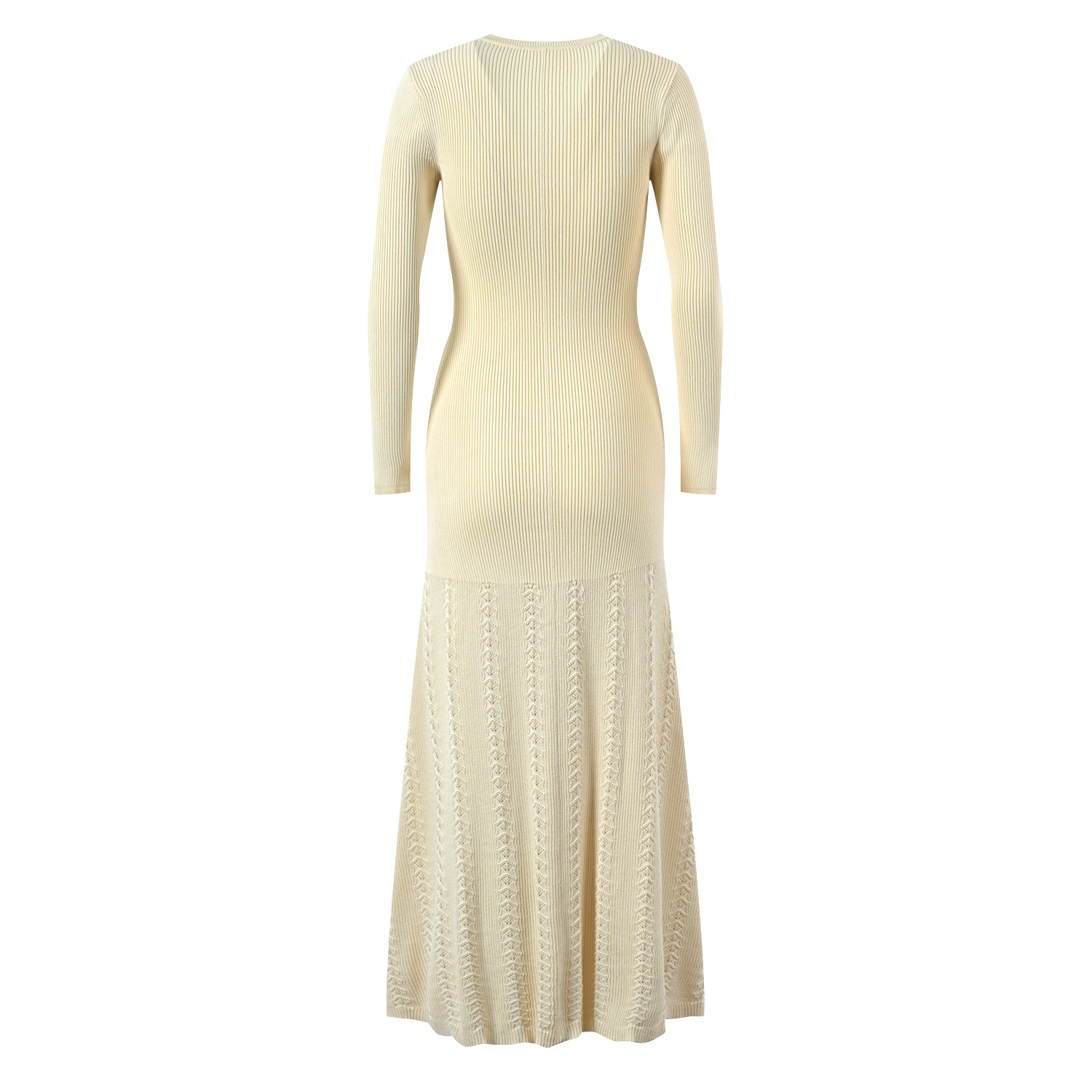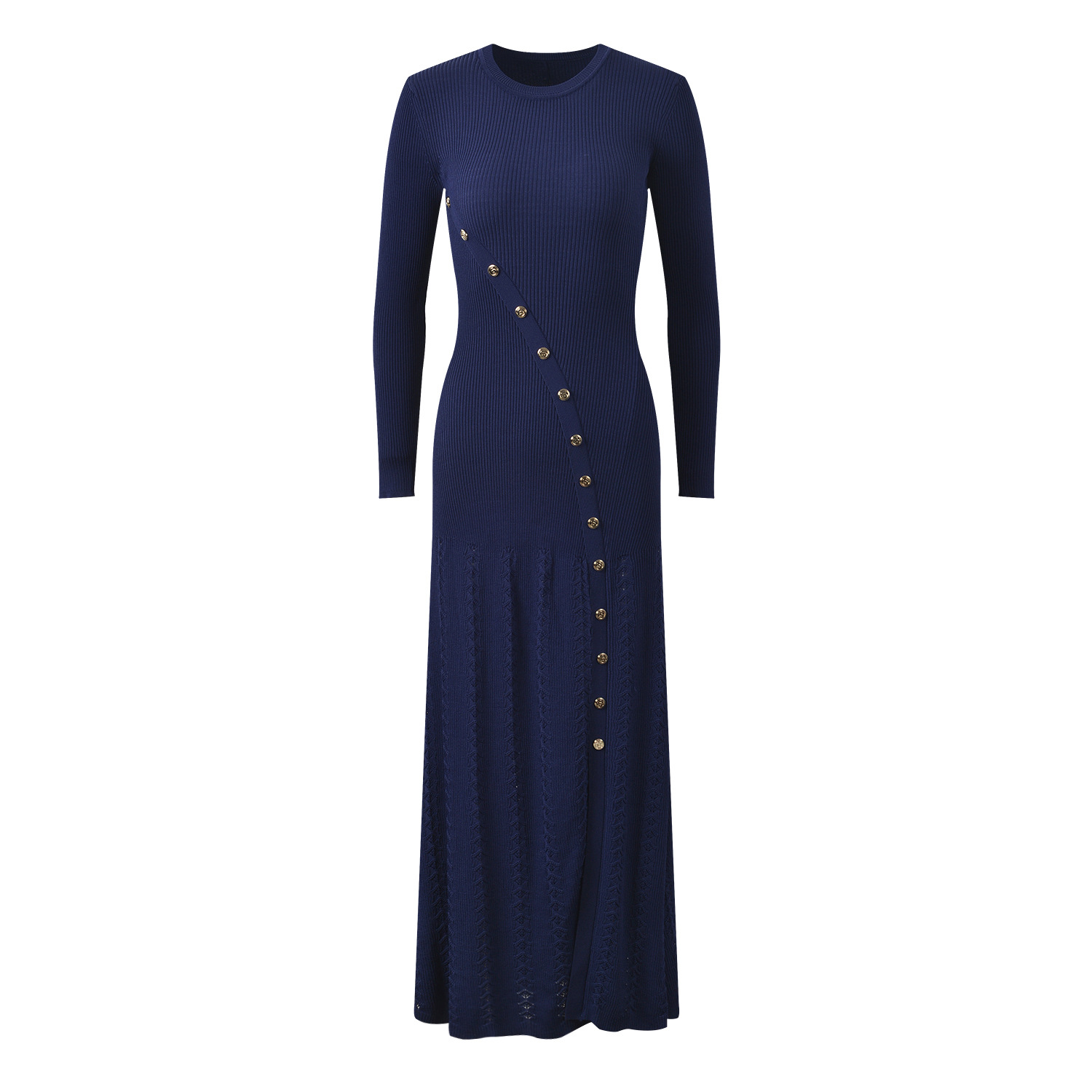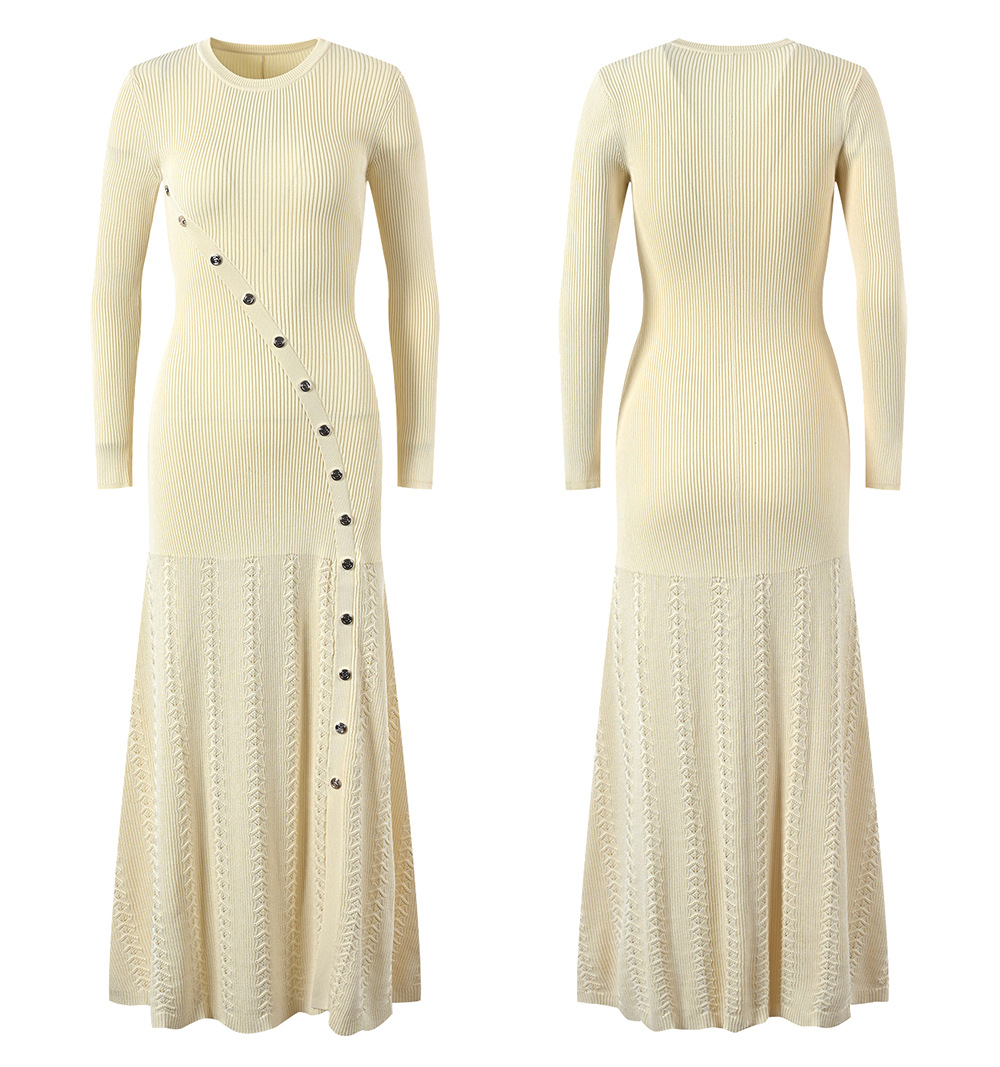 Women Metal Diagonal Buckle Mid-Length Dress Spring 2024 New Lady O-Neck Long Sleeve Thread Slit Hem Slim Long Robe 5230463